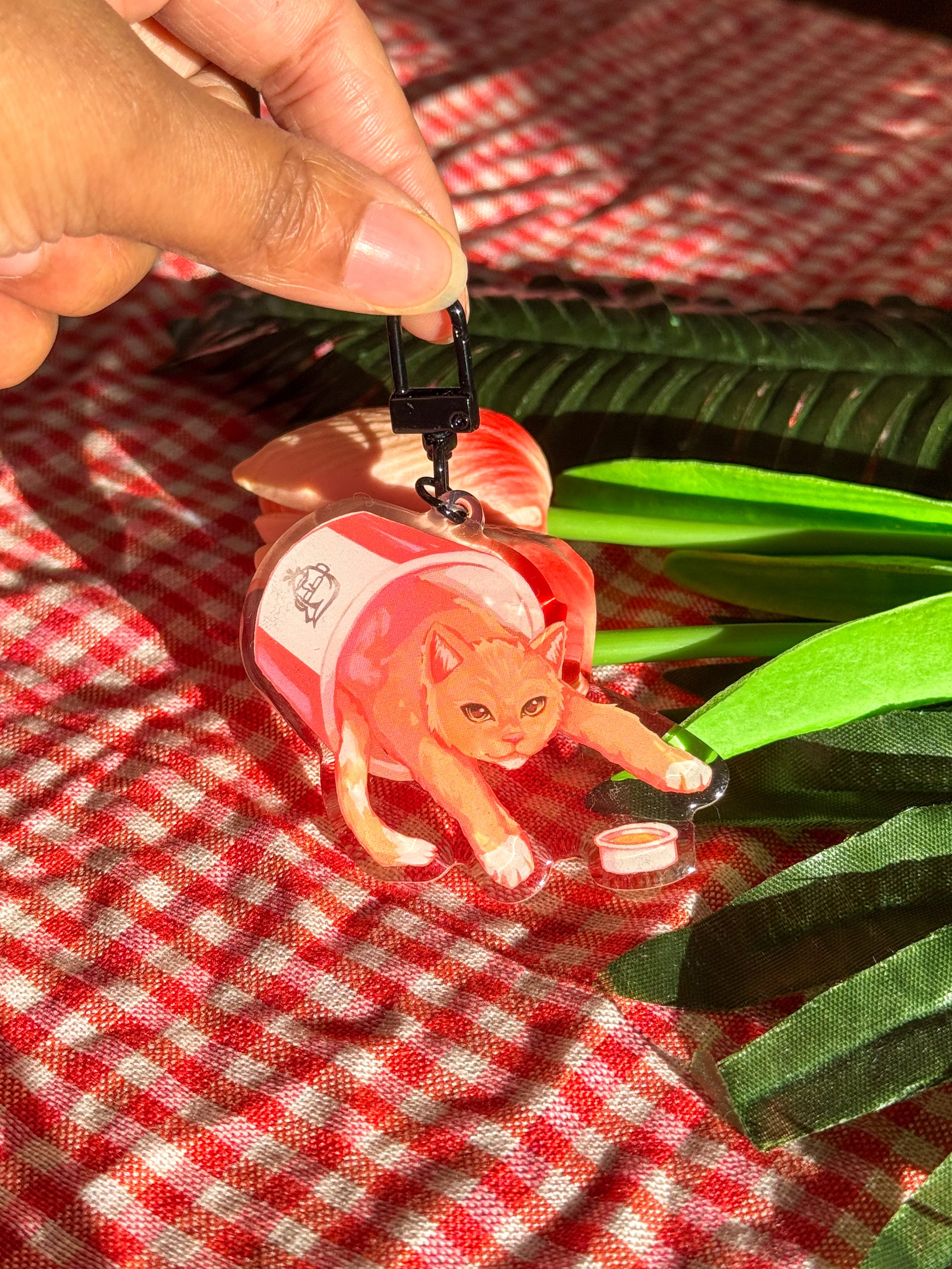– Cat in a Chicken Bucket – A mischievous orange cat peeking out of a fried chicken bucket with a black clasp