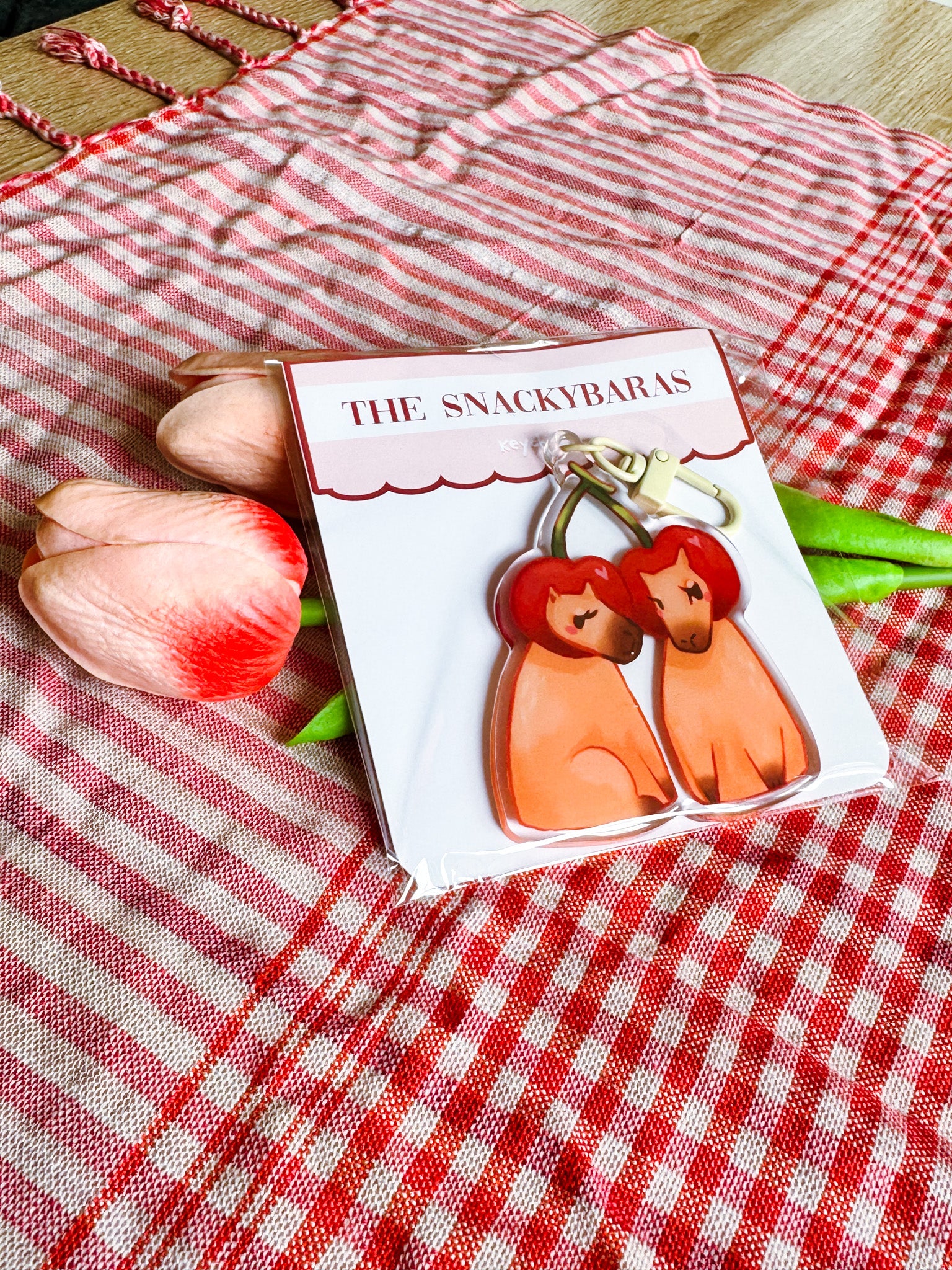 Bring some fruity flair to your keys, bag, or backpack with these adorable Fruity-bara acrylic keychains! Each design features a chill capybara rocking its favourite fruit – from juicy peaches to playful cherries – with a glossy epoxy dome on the front for extra shine and durability.